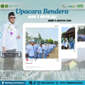 Boyolali, 11 Agustus 2025 – Lapangan MAN 2 Boyolali pagi ini menjadi saksi pelaksanaan upacara bendera rutin setiap Senin yang dihadiri seluruh siswa, guru, dan tenaga kependidikan. Bertindak sebagai pembina upacara, Kepala Madrasah H. Maryono, S.Pd., M.Pd. menyampaikan amanat dengan mengangkat tema “Mens sana in corpore sano” yang berarti “Di dalam tubuh yang sehat terdapat jiwa yang kuat.”